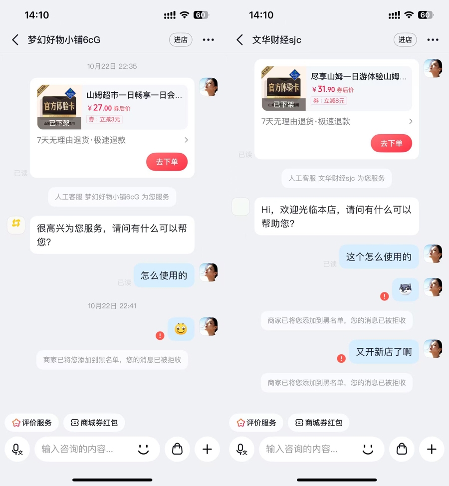 被骗后的第2天,钟女士发现,关掉了一家店,更多家店在平台上冒出来。她再次搜索“山姆会员”,并联系新店铺的客服询问“如何使用”。然而这次,多家店铺的客服在收到她的消息后,并没有回复她那张“流程图”,而是直接将她拉黑。“他们好像认识我”,钟女士意识到,这些源源不断涌出的店铺似乎是同一伙人。
