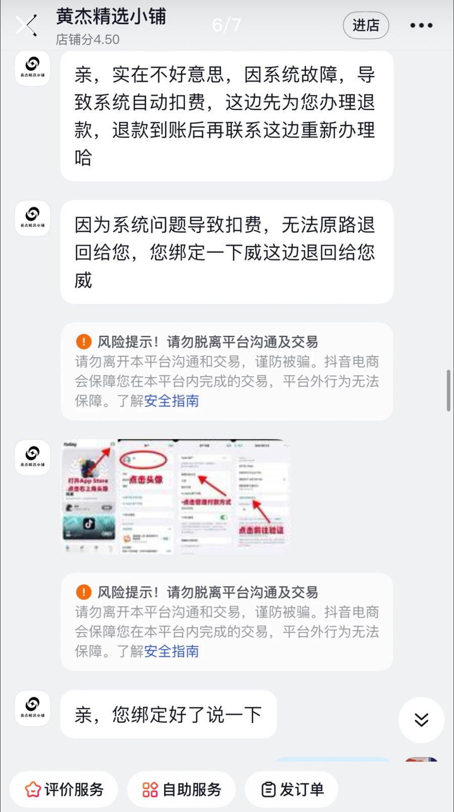 来自广西的谭女士也因同样的招数陷入骗局,10月11日,她在平台商城购买了山姆会员一日卡,下单后,名为“黄杰精选小铺”店铺的客服给她发送了一张充值流程图。图中显示,需要她提供苹果账户的账号和密码,客服表示“需要使用苹果商店礼品券开通”,并反复强调“过程中您无需退出账户,无需担心隐私问题”。